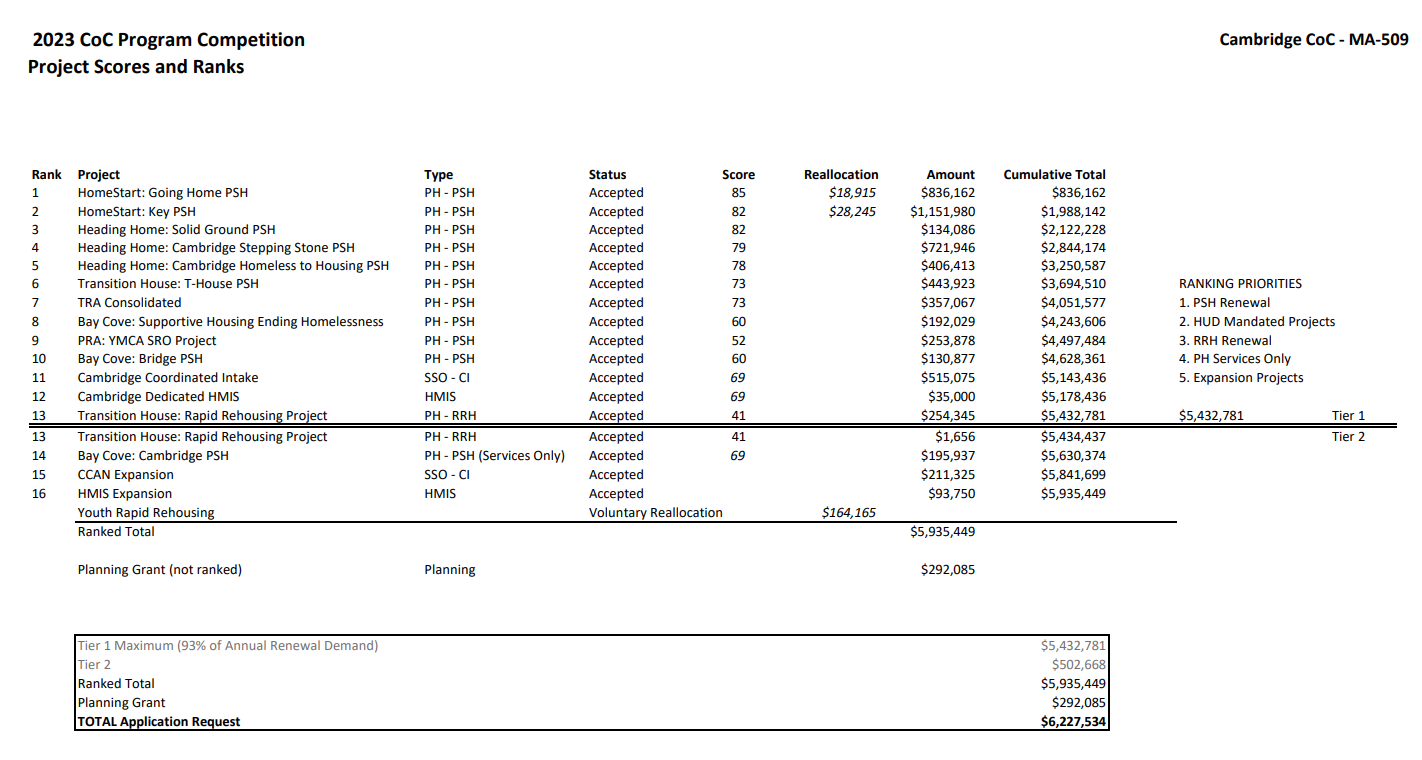 The Project Ranking List for the 2023 CoC competition is available on the CoC’s website. This listing includes all projects that have been approved and ranked for inclusion in the Cambridge CoC’s annual submission to HUD for CoC Program funds. The 2023 Ranking list is available here: